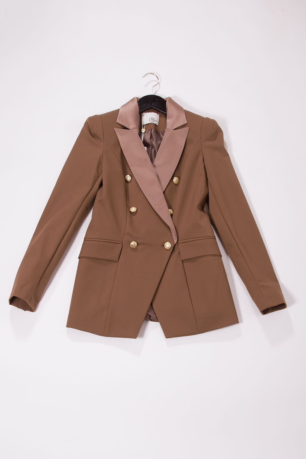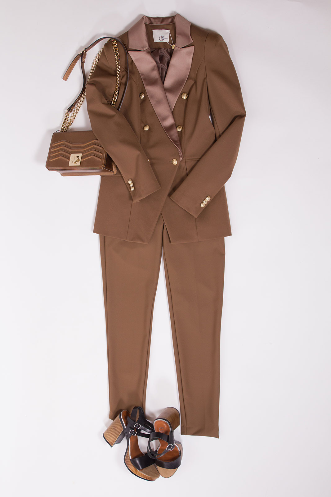Kostým camel Relish s lesklýma klopama a zlatými knoflíky. Sako výborně padnoucí, vypasované na tělo.