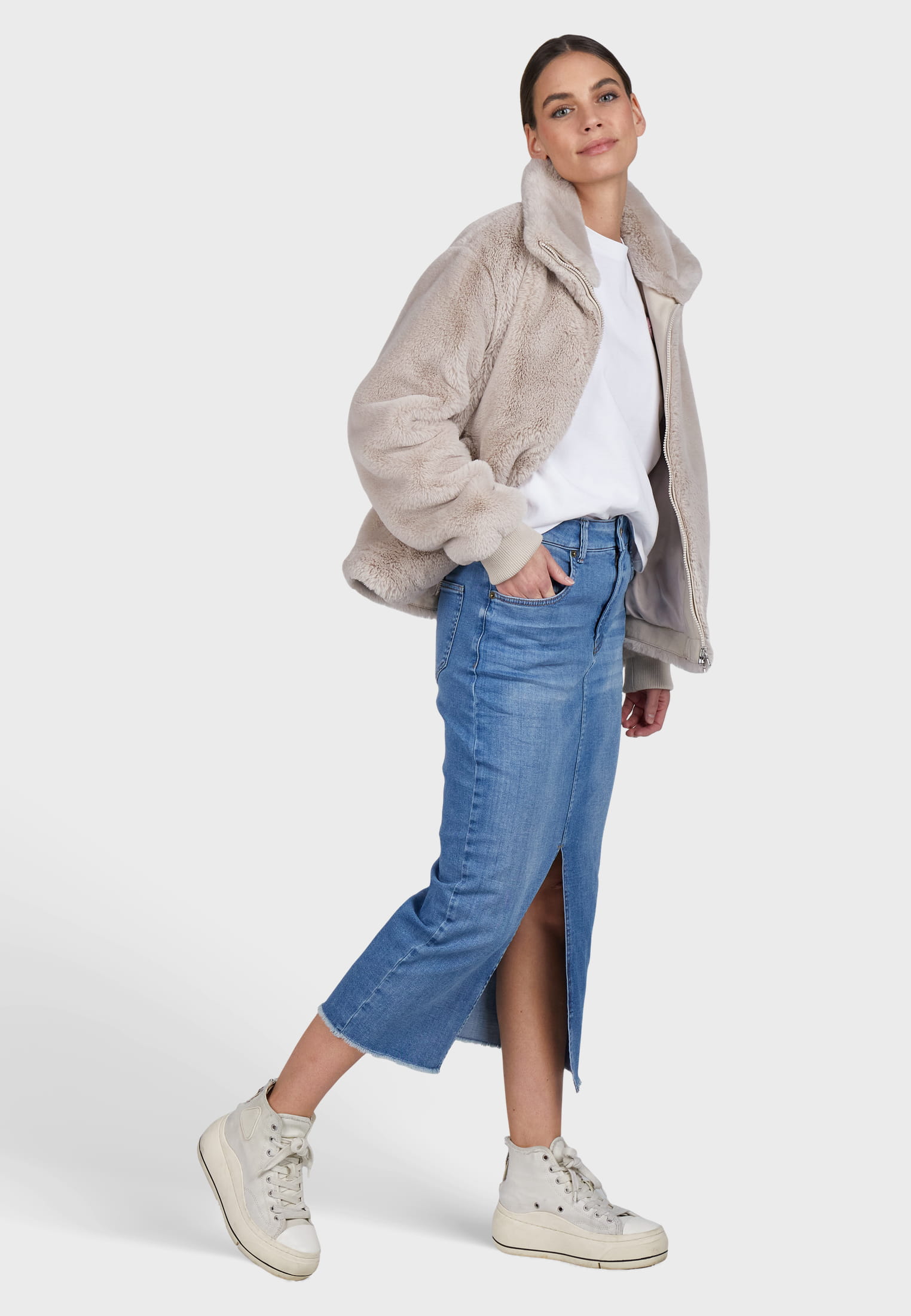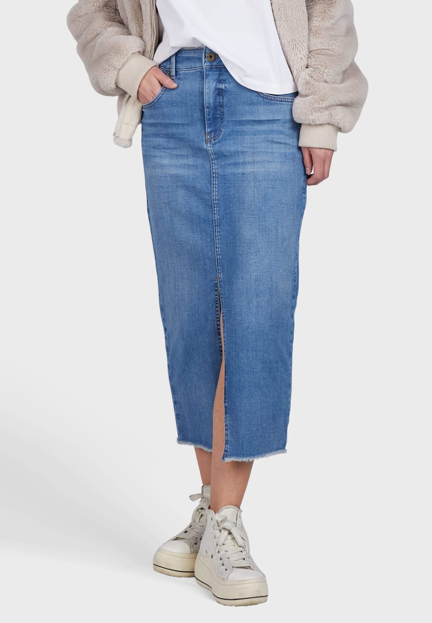 Naše modrá džínová sukně je vyrobena z měkké strečové bavlněné směsi pro úzký střih. Kombinuje klasický denimový styl s pohodlím a svobodou pohybu. Ideální k ležérním outfitům s nádechem elegance.