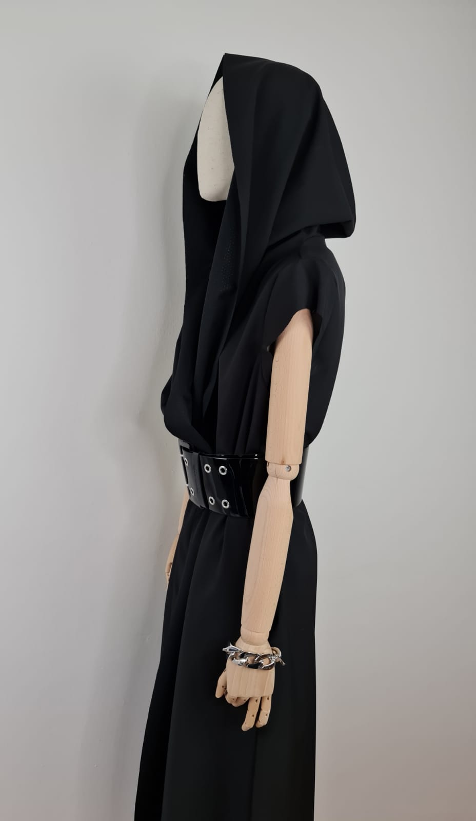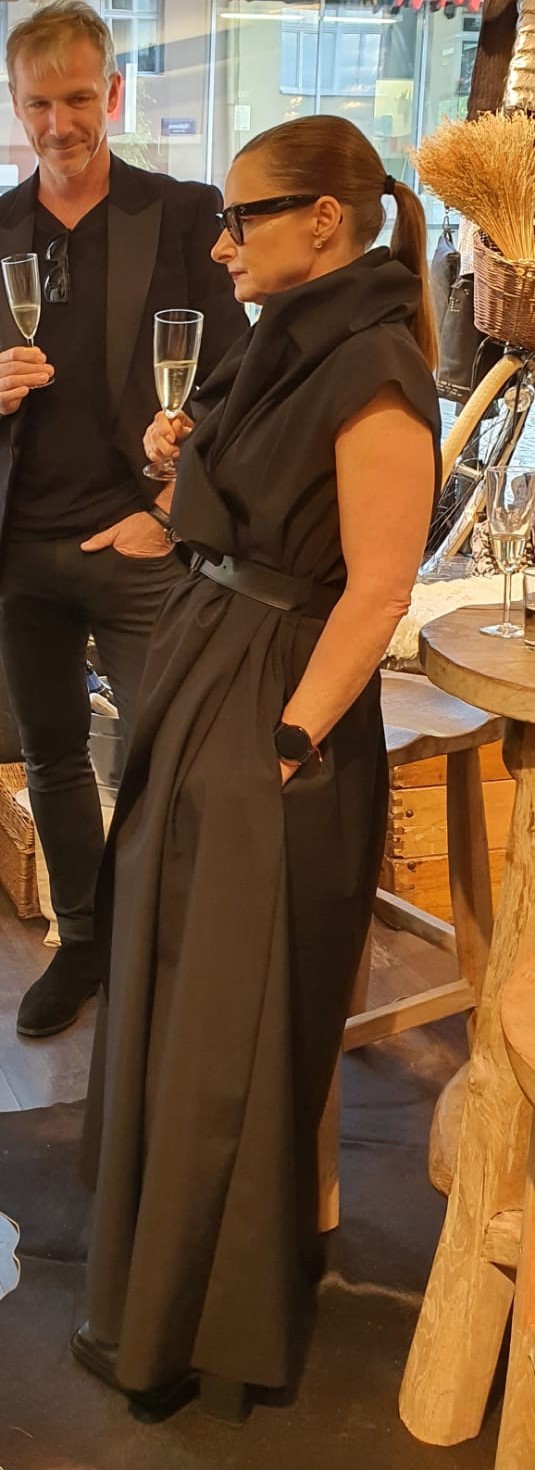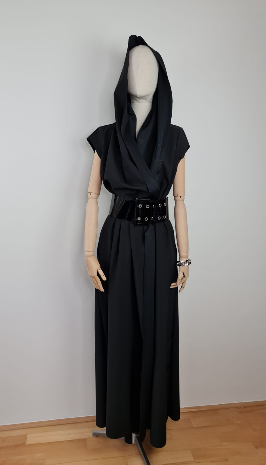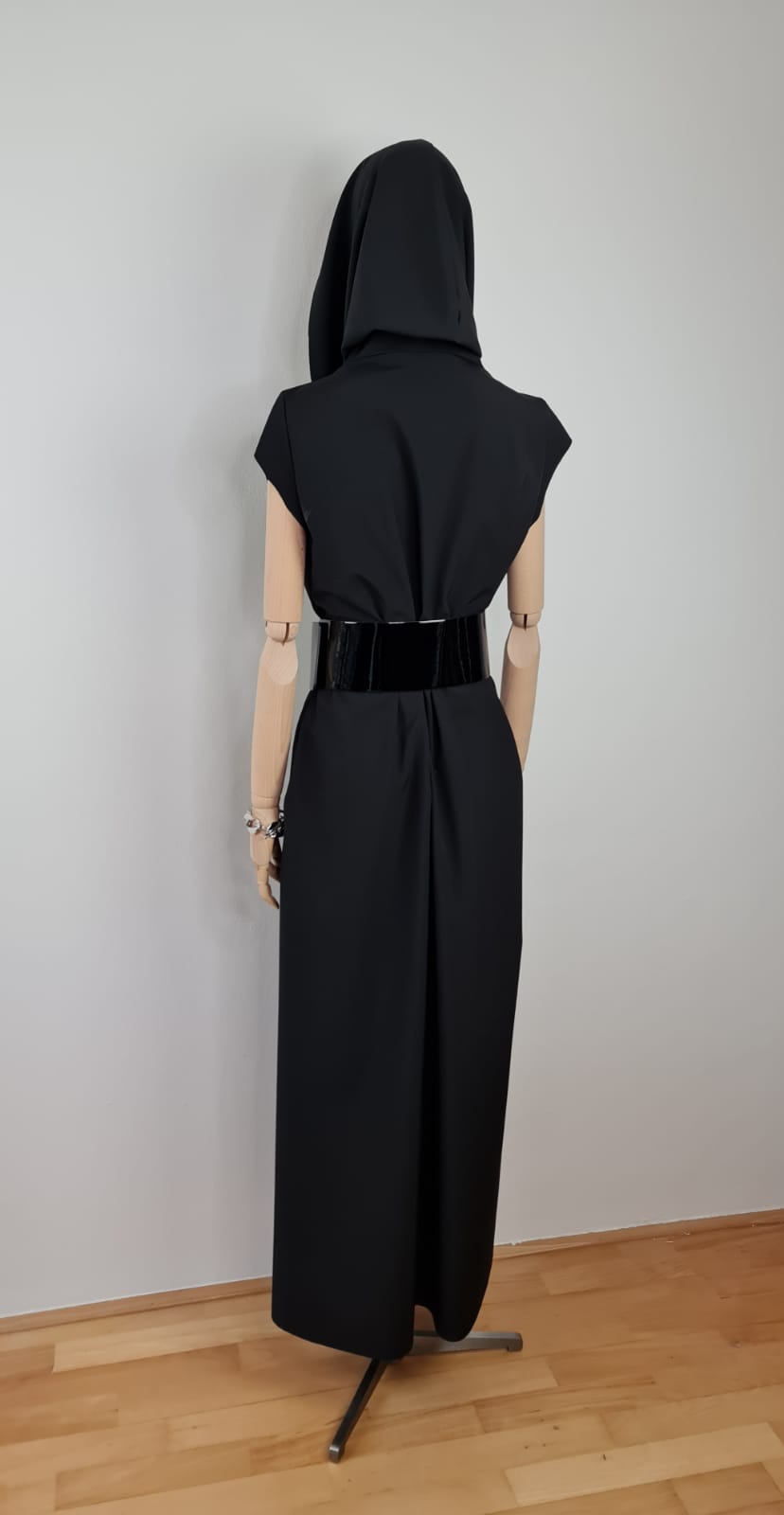 Dlouhé, modelové zavinovací šaty. Velký límec, nebo kapuce. Funkční materiál. Součástí šatů je pásek ze stejného materiálu. Na fotografii pásek Denny Rose, který lze zakoupit zvlášť. V bočních švech jsou kapsy. Šaty se dají nosit i jako plášť s kalhotami. Dají se různě tvarovat. Je to model. Součástí šatů je brož - zobrazena na fotografii.