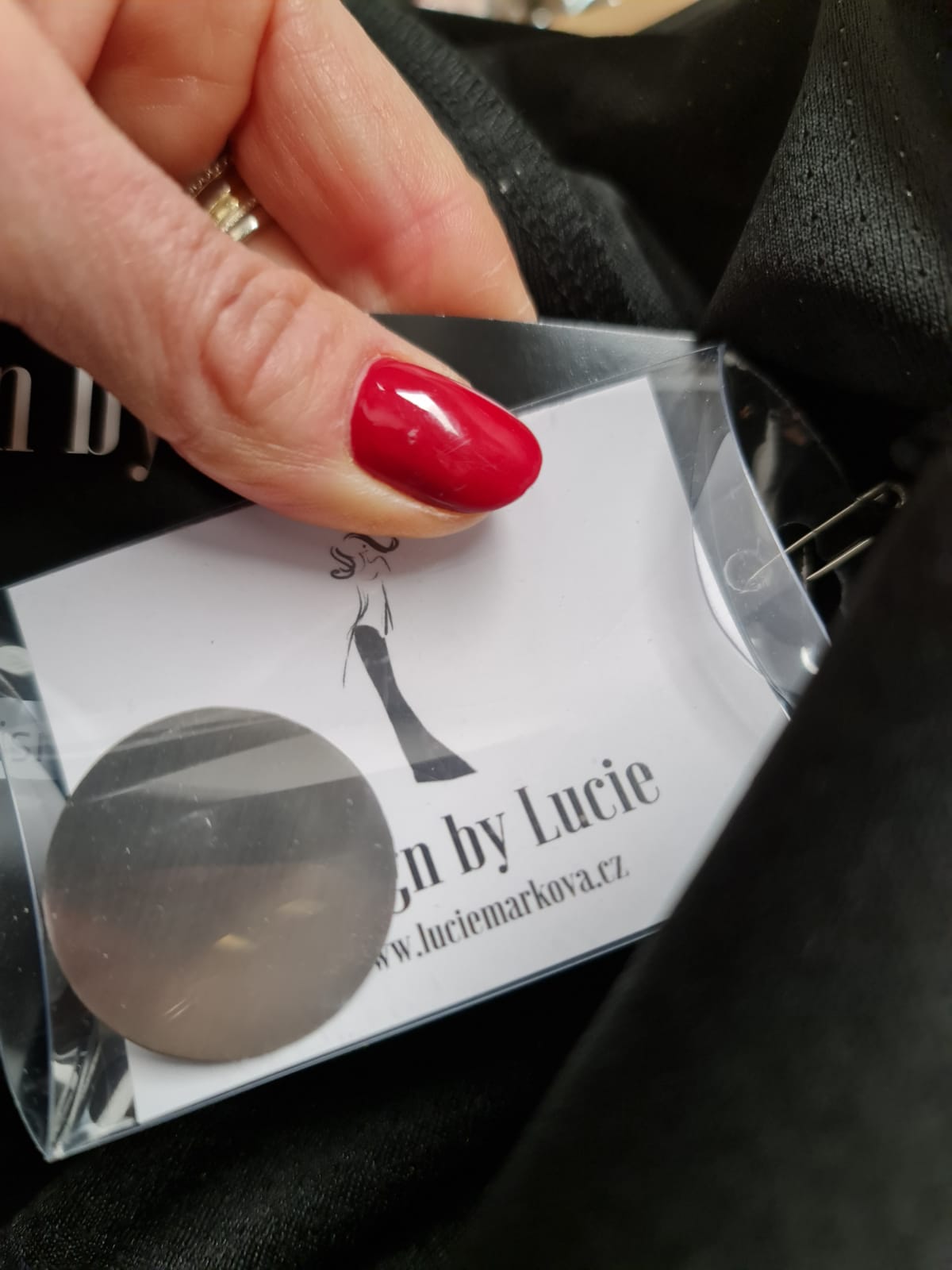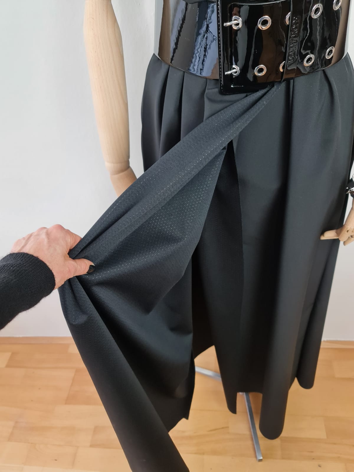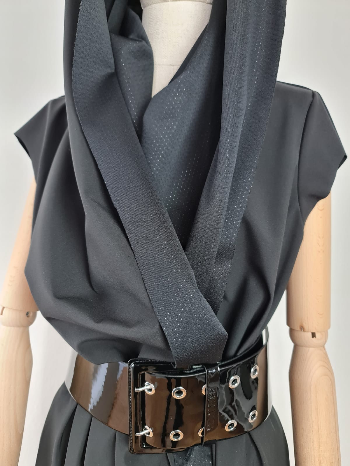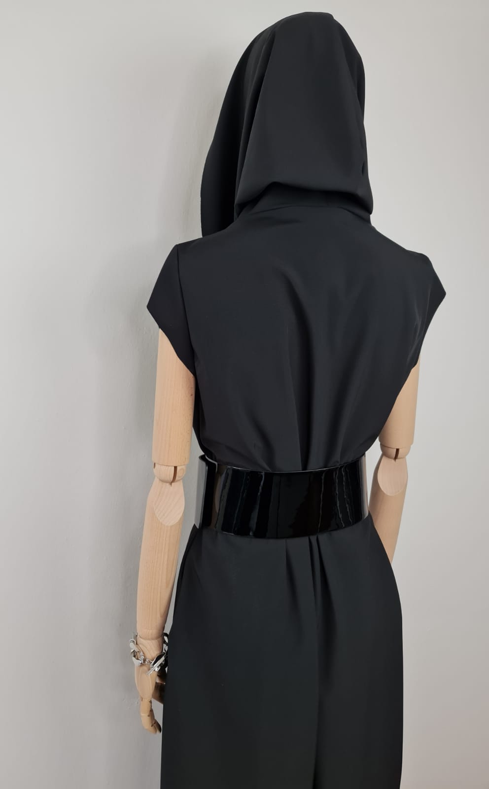 Dlouhé, modelové zavinovací šaty. Velký límec, nebo kapuce. Funkční materiál. Součástí šatů je pásek ze stejného materiálu. Na fotografii pásek Denny Rose, který lze zakoupit zvlášť. V bočních švech jsou kapsy. Šaty se dají nosit i jako plášť s kalhotami. Dají se různě tvarovat. Je to model. Součástí šatů je brož - zobrazena na fotografii.